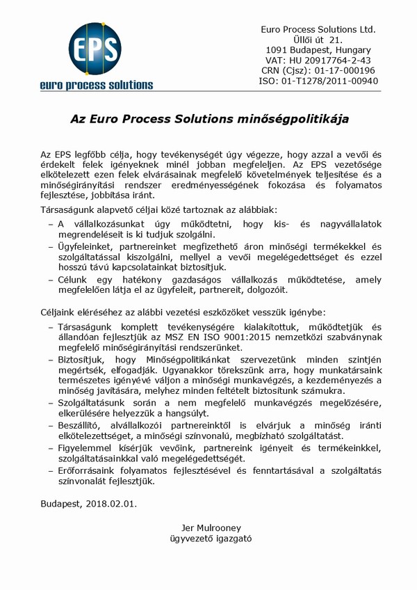 It is the policy of EPS to consistently ensure a high level of product and service quality and to establish and implement the necessary controls to ensure this.